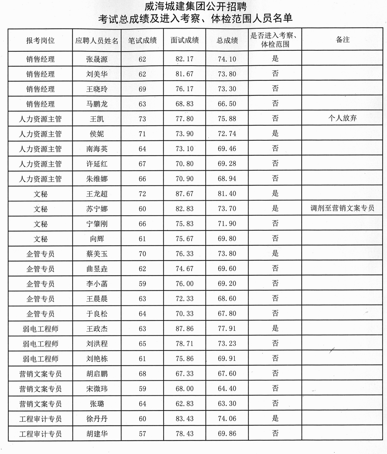 威海城建集團公開招聘考試總成績及進入考察、體檢范圍人員名單