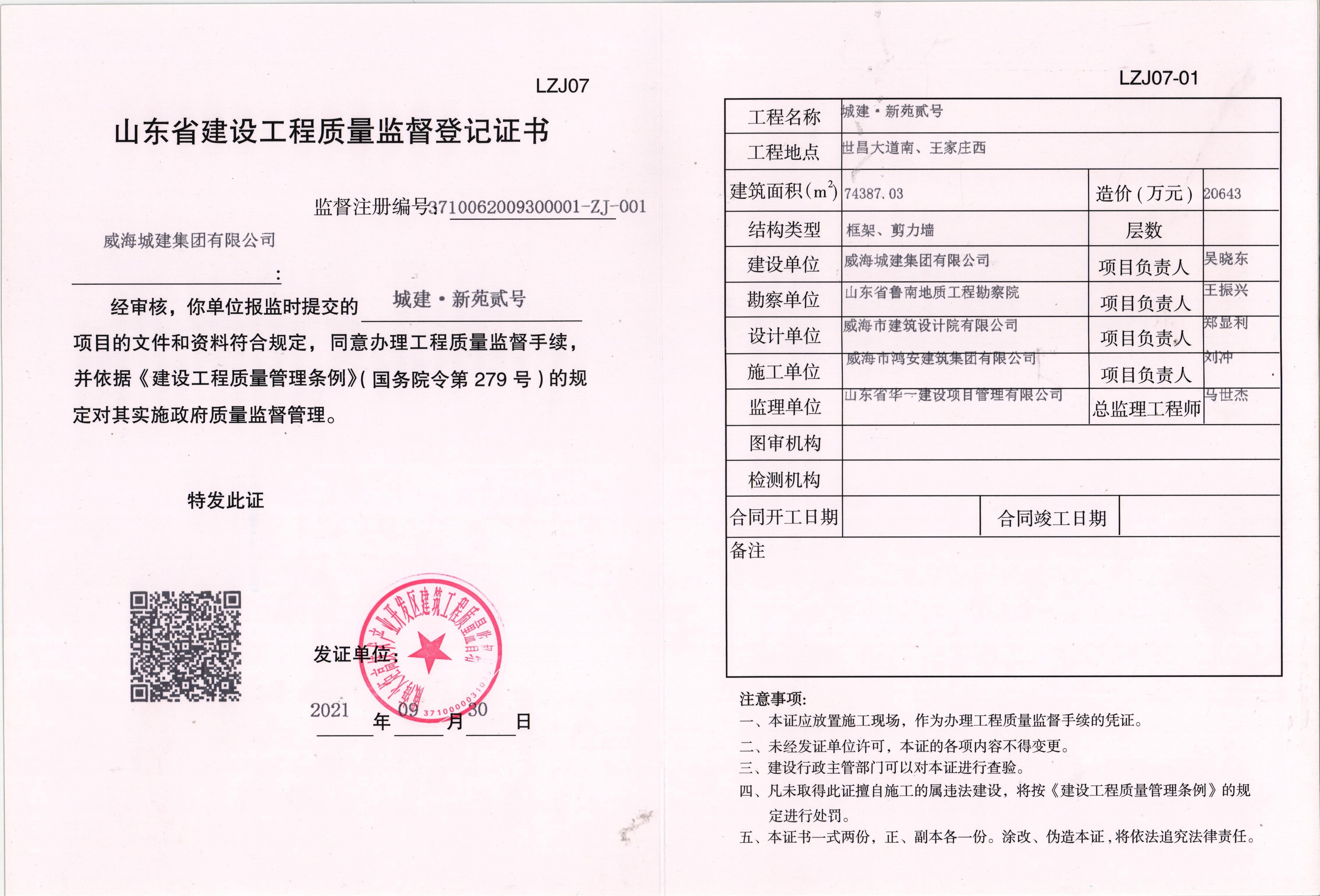 建設單位:威海城建集團有限公司                       負責人:吳曉東