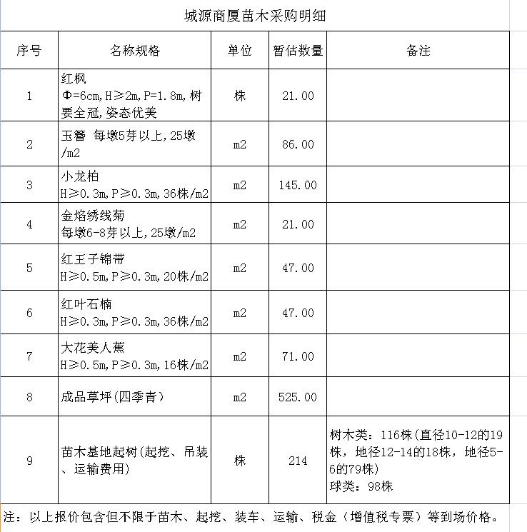(4)采購(gòu)內(nèi)容:城源商廈項(xiàng)目綠化苗木的采購(gòu)及苗木基地樹(shù)苗的起挖、裝車(chē)并運(yùn)輸?shù)焦さ刂付ǖ攸c(diǎn),采購(gòu)清單詳見(jiàn)附件。
